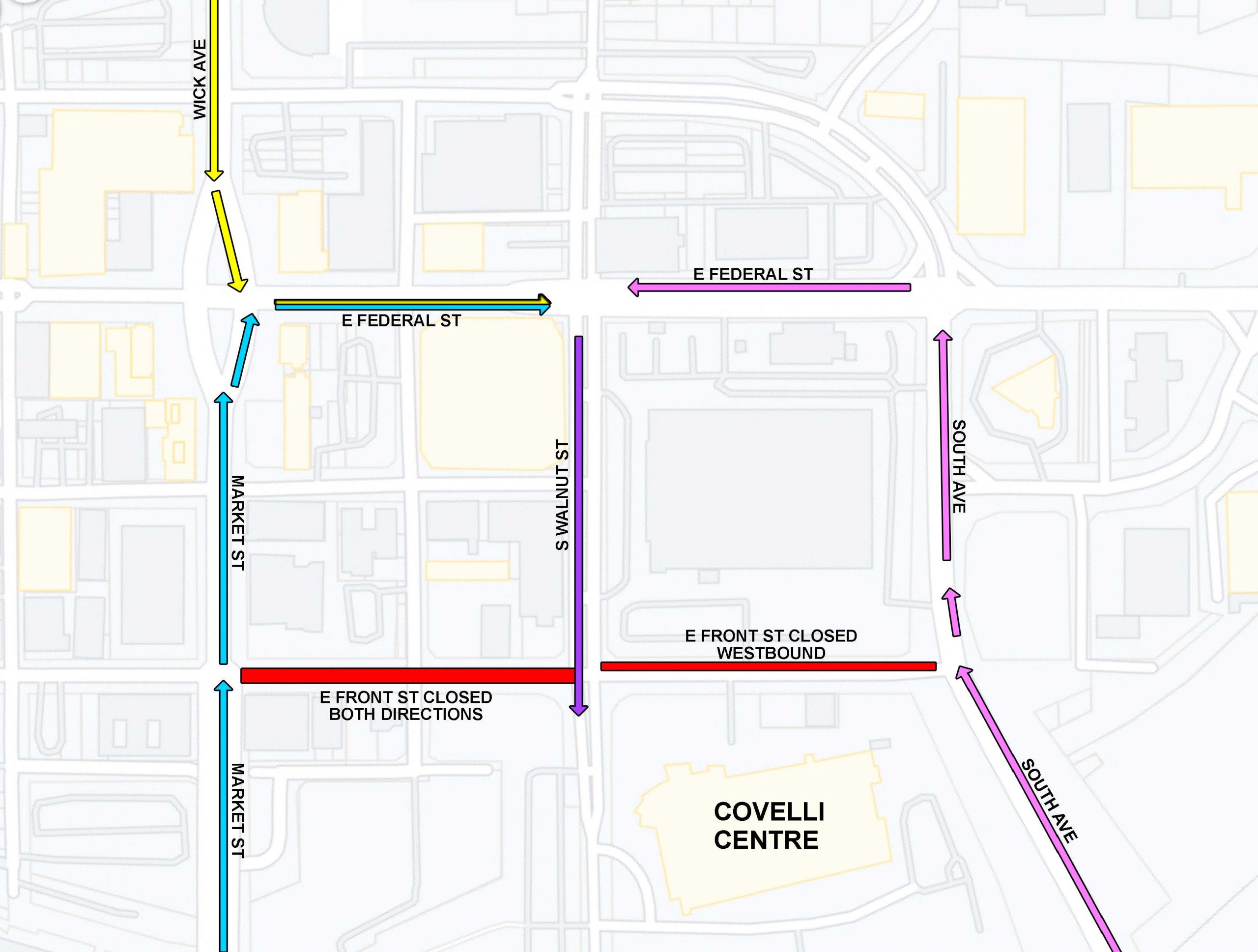 When entering downtown via Wick Avenue, proceed to Federal Street and turn left. Then make a right on Walnut Street and proceed straight into the Covelli Centre’s parking lot.